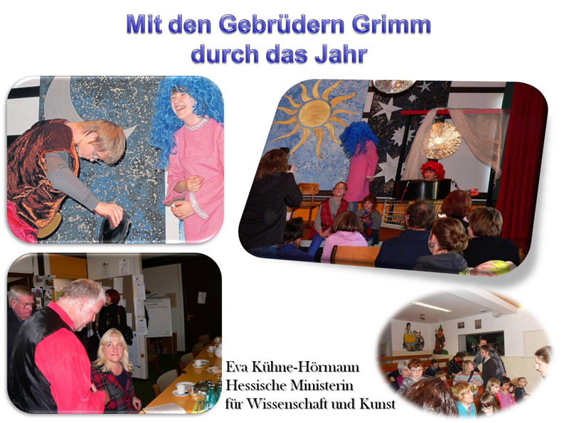 Unter Mitwirkung einer Theaterpädagogin wurde Schneewittchen als Theaterstück eingeübt, immer wieder in anderen Variationen geprobt und dann endlich am 08. Oktober 2012 der Schulgemeinde, in Anwesenheit von Vertretern des Landkreises, des staatlichen Schulamtes, des Bürgermeisters von Frankenberg und der Hessischen Staatsministerin für Wissenschaft und Kunst, Frau Eva Kühne Hörmann, präsentiert.