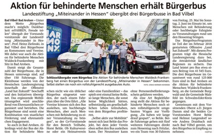 Schlüsselübergabe vom Bürgerbus Die Aktion für behinderte Menschen Waldeck-Frankenberg hat einen Bürgerbus von der Landesstiftung „Miteinander in Hessen“ bekommen. Selbst stellen sie noch ein rollstuhlgerecht ausgebautes Auto.